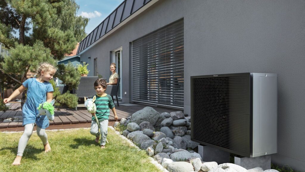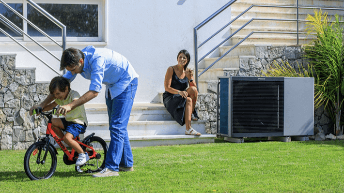 L’unità esterna Daikin Altherma estrae fino al 75% della propria energia dall’aria esterna per fornire riscaldamento, raffrescamento e acqua calda sanitaria, mentre l’energia restante è fornita dall’elettricità.