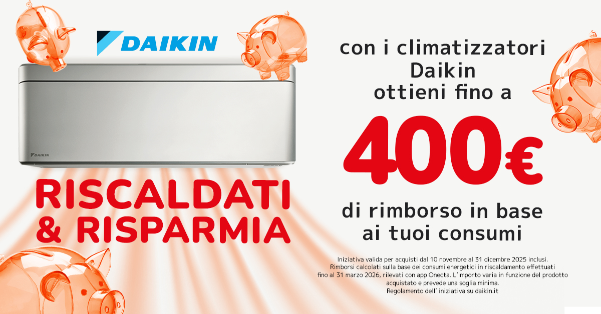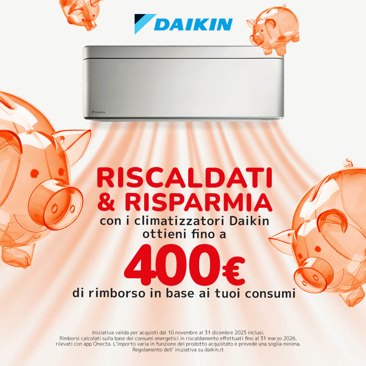 Acquistando un climatizzatore Daikin entro il 31/12/2025 hai la possibilità di ottenere un cashback da 100 a 400 € in base al modello acquistato. Daikin monitora il consumo fino al 31/03/2026 e ti rimborsa 0,30 € per ogni Kwh speso in riscaldamento, fino al massimale.